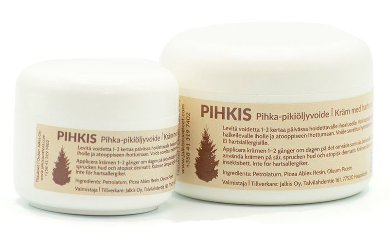 Pihkis pihka-pikiöljyvoide. Koko perheen yleisvoide, josta on avuksi moneen vaivaan. Pihka nopeuttaa haavojen parantumista ja vähentää tulehdusta. Pihkan hoitavien ominaisuuksien vuoksi voide soveltuu proriasis- ja atooppisen ihottuman hoitoon. Voiteella saat avun halkeilevalle iholle ja kantapäiden kovettumiin. Voide hoitaa diabeetikon haavat tehokkaasti. Voiteessa käytetty pikiöljy puolestaan toimii luonnollisena hyttysten karkottajana ja auttaa hyönteisten puremien aiheuttamassa kutinassa. Voidetta voi käyttää myös eläimille. Tuote ei sisällä keinotekoisia haju-, väri- tai säilöntäaineita.