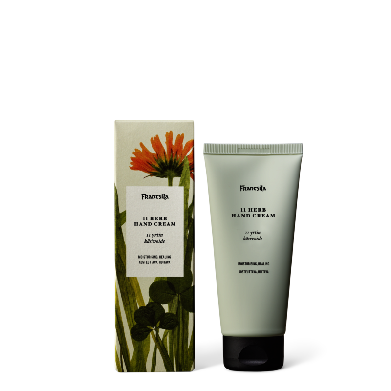 11 yrtin käsivoide pitää kädet ja kynsinauhat pehmeinä ja hyväkuntoisina. Luomulaatuiset ravitsevat kasviöljyt sisältävät runsaasti hivenaineita ja vitamiineja. Frantsilan 11 luonnonmukaisesti viljellyn yrtin uutos hoitaa ja parantaa ihon epiteeliä.