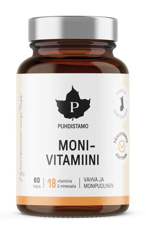 Vahva monivitamiinikokonaisuus 18 tärkeällä vitamiinilla ja mineraalilla, joissa optimoidut määrät parhaita vitamiini- ja mineraalimuotoja B2-, B6-, B9- (folaatti) ja B12-vitamiineista niiden aktiivisissa muodoissaan. Täyteaineeton. Valmistettu Suomessa.