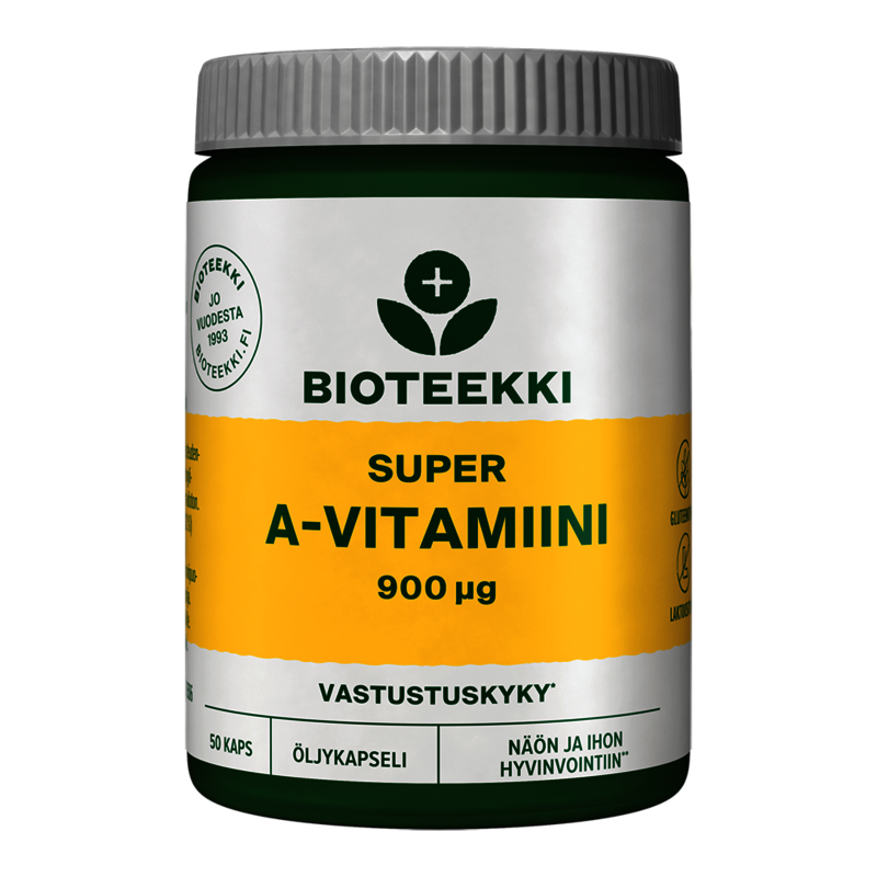Super A-vitamiini sisältää 900 µg A-vitamiinia hyvin imeytyvässä öljykapselissa. A-vitamiini liitetään perinteisesti silmien, limakalvojen ja ihon hyvinvointiin. A-vitamiini edistää myös luontaista vastustuskykyämme sekä tukee solujen uudistumista.