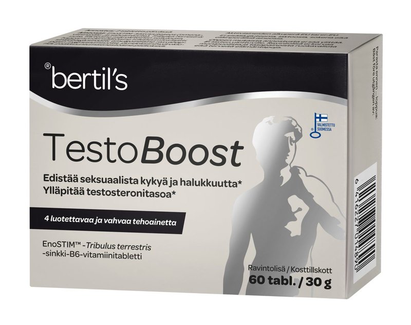 bertil´s Testo Boost on luotettava Suomessa kehitetty ja valmistettu yhdistelmävalmiste, joka on huolellisesti suunniteltu erityisesti miehistä hyvinvointia ajatellen - normaalin testosteronitason ylläpitoon ja seksuaalisen halukkuuden ja kyvyn edistämiseen. Se sisältää 4 luotettavaa, tutkittua ja vahvaa tehoainetta: EnoSTIM™ -kasviuuteseoksen, Tribulus terrestris -uutteen, sinkkiä ja B6-vitamiinia.